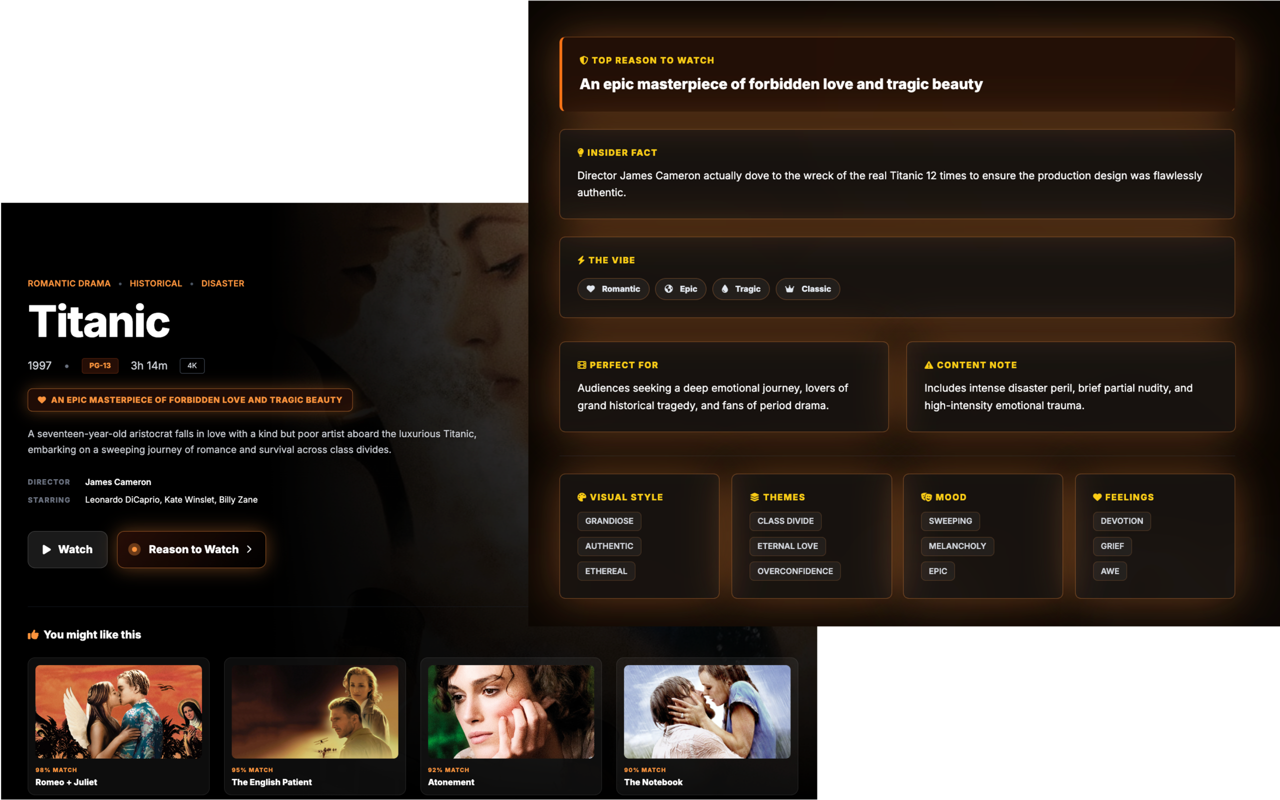 Metaprofile.tv delivers AI-generated cinematic metadata that turns any movie or series into a rich, modern “Reason to Watch” experience, including hooks, vibes, emotional DNA, star dynamics, and audience fit for advanced TV interfaces.